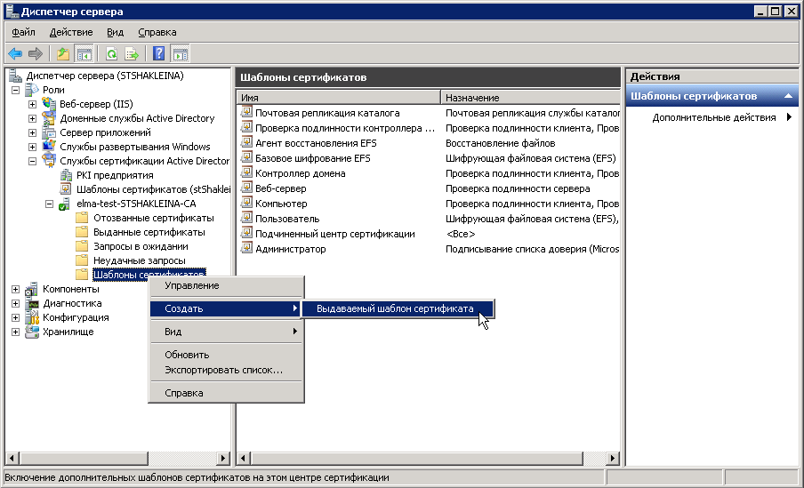 Рис. 32. Диспетчер сервера. Пункт меню "Шаблоны". Кнопка контекстного меню "Создать – Выдаваемый шаблон сертификата"