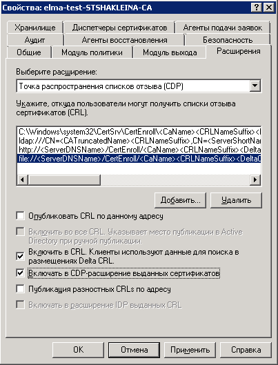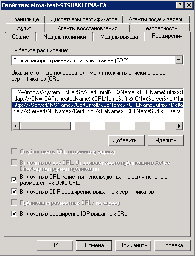 19. Далее необходимо подключить расширения в настройках созданного ЦС. Для этого необходимо вызвать контекстное меню данного ЦС и выбрать пункт Свойства . Далее необходимо перейти на вкладку Расширения , в списке отзыва сертификата выбрать пункт http://<ServerDNSName>/CertEnroll/<CaName><CRLNameSuffix><DeltaCRLAllowed>.crl и установить ниже него все доступные флажки (рис. 20).