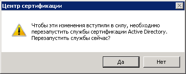 После выполнения перезапуска службы сертификации необходимо нажать на кнопку ОК . Далее необходимо перезагрузить компьютер для применения внесенных изменений.