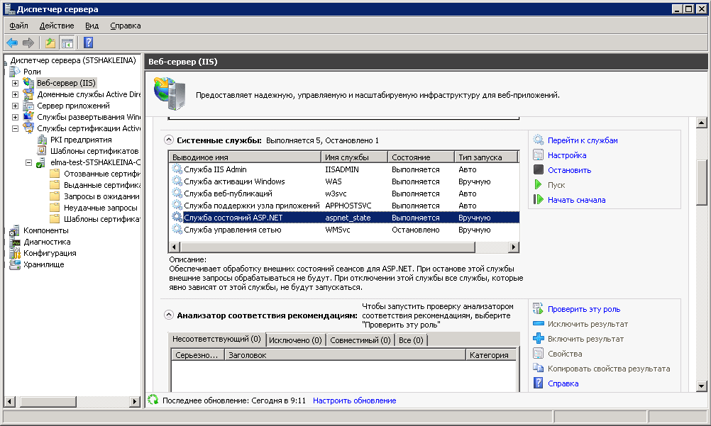 Рис. 34. Диспетчер сервера. Служба состояний ASP.NET