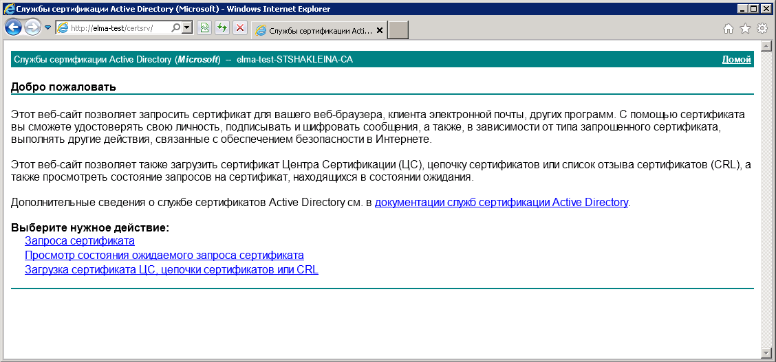 Рис. 36. Главная страница центра сертификации