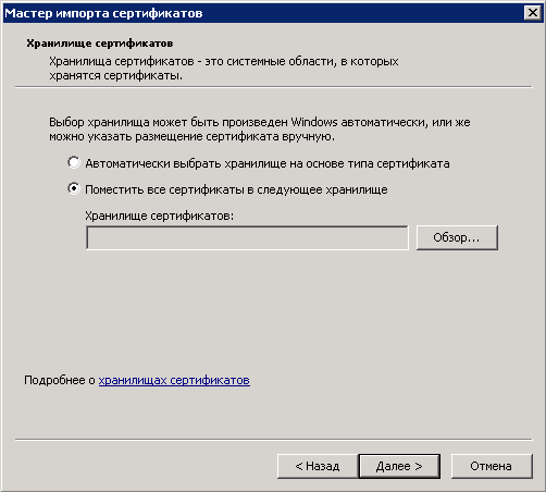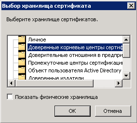 Рис. 39. Диалоговое окно ручного выбора хранилища сертификатов