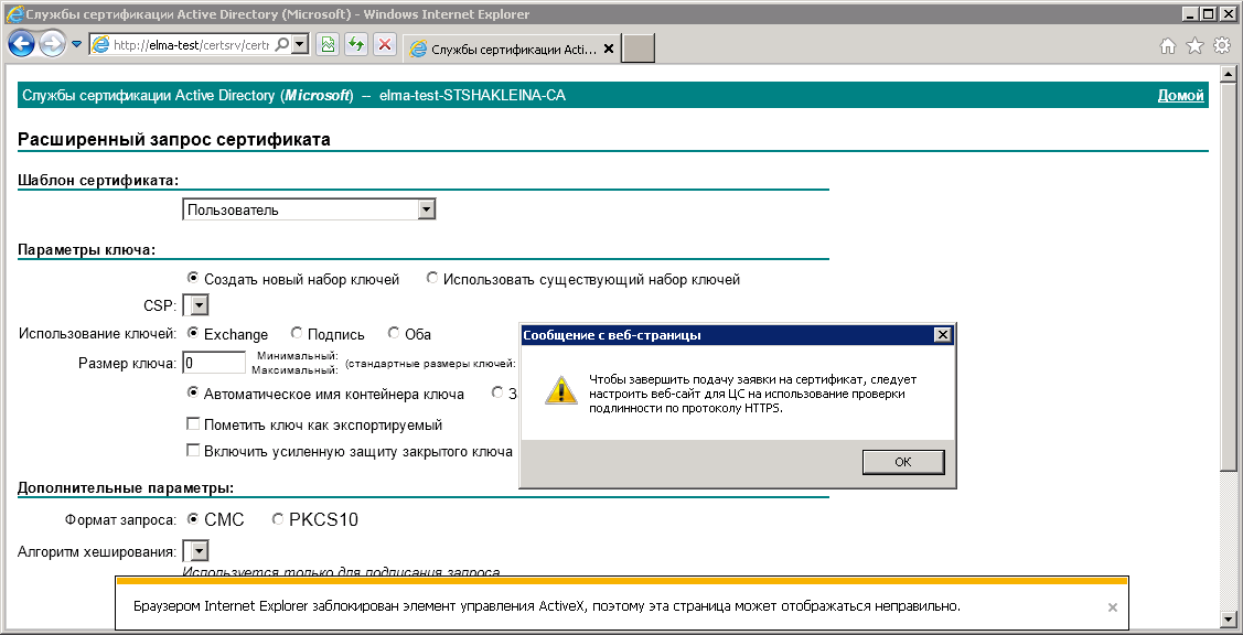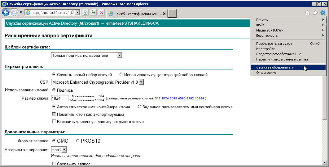 Рис. 49. Веб- браузер Internet Explorer. Форма расширенного запроса сертификата