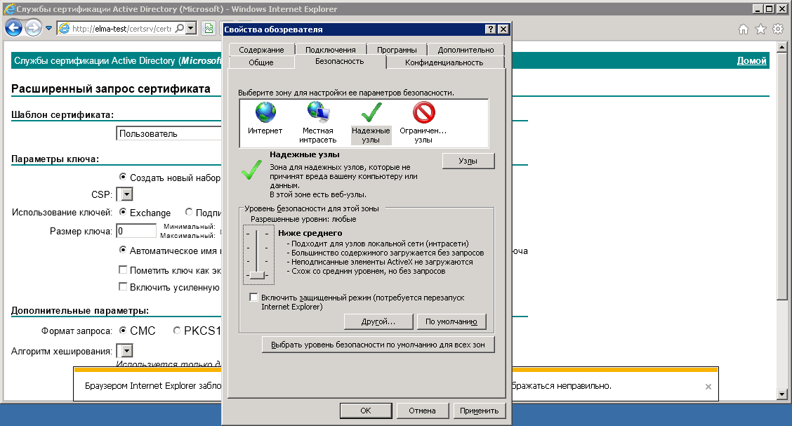 При попытке создать запрос сертификата может быть отображено следующее предупреждение (рис. 43), в котором необходимо нажать на кнопку ОК . В данном случае необходимо добавить текущий узел в зону Надежные узлы и установить низкий уровень безопасности для этой зоны.