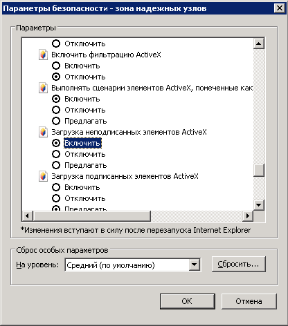 Также необходимо разрешить загрузку неподписанных ActiveX . Для этого необходимо на вкладке Безопасность нажать на кнопку Другой… и в окне Параметры безопасности (рис. 47) в группе Элементы ActiveX и модули подключения установить все переключатели в положение Включить . Для сохранения внесенных изменений необходимо нажать на кнопку ОК .