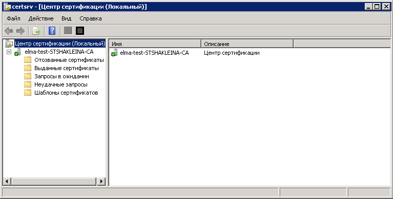 Для первоначальной проверки работоспособности ЦС необходимо запустить оснастку Центр сертификации ( Пуск – Администрирование – Центр Сертификации ). В том случае, если все настроено верно, будет отображено следующее окно (рис. 35).