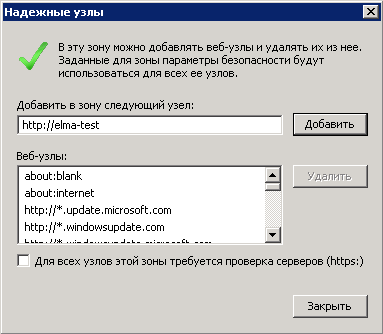 Далее требуется добавить текущий сайт к надежным узлам. Для этого необходимо на данной вкладке ( Безопасность ) нажать на кнопку Узлы и в открывшемся диалоговом окне (рис. 46) нажать на кнопку Добавить , а также снять флажок Для всех узлов этой зоны требуется проверка серверов ( https:). Для сохранения изменений необходимо нажать на кнопку Закрыть .
