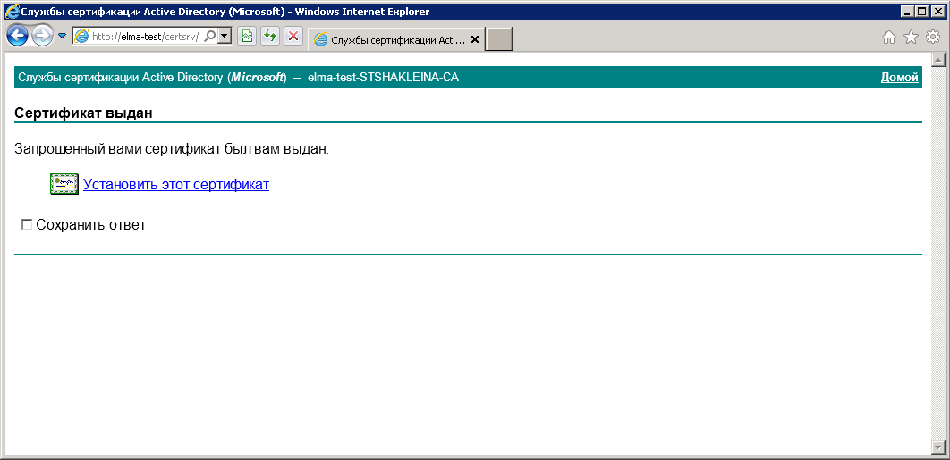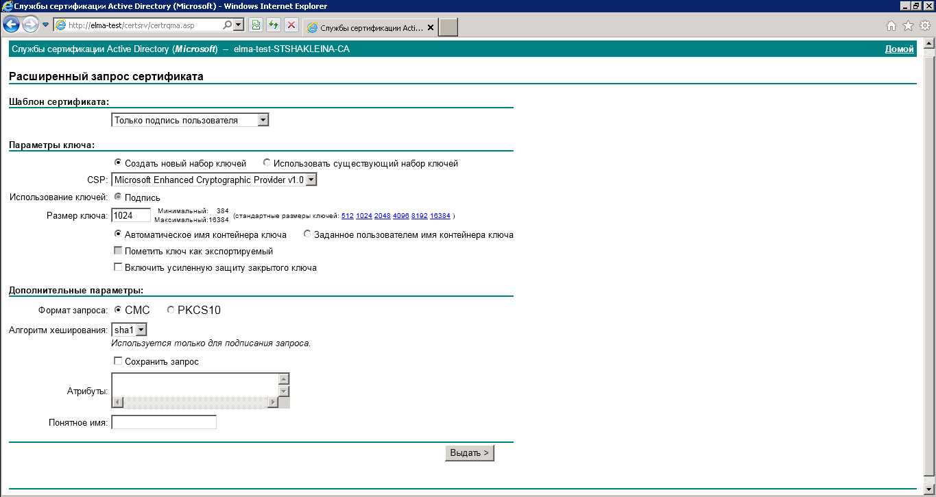 Для получения клиентского сертификата необходимо открыть сайт ЦС в браузере в Internet Explorer и выбрать Запрос сертификата – расширенный запрос сертификата – Создать и выдать запрос к этому ЦС .