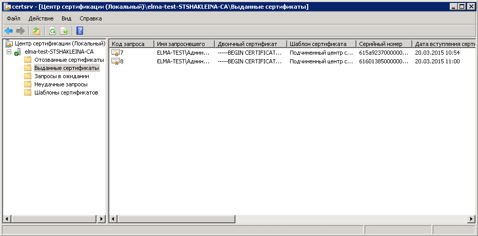 Рис. 52. Центр сертификации. Раздел "Выданные сертификаты"