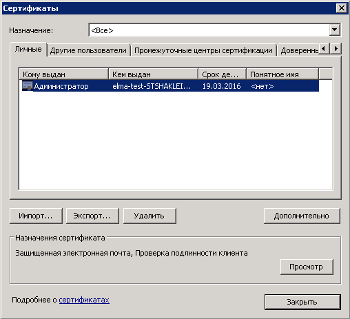 В открывшемся диалоговом окне (рис. 55) на вкладке Личные будут отображены все личные сертификаты, полученные текущим пользователем.