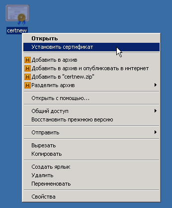 Рис. 37. Контекстного меню сертификата. Кнопка "Установить сертификат"