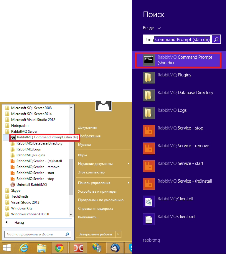 После выполнения перезагрузки компьютера необходимо запустить командную строку RabbitMQ (не от администратора). Запуск может быть осуществлен из меню Пуск или через поиск по слову "RabbitMQ".