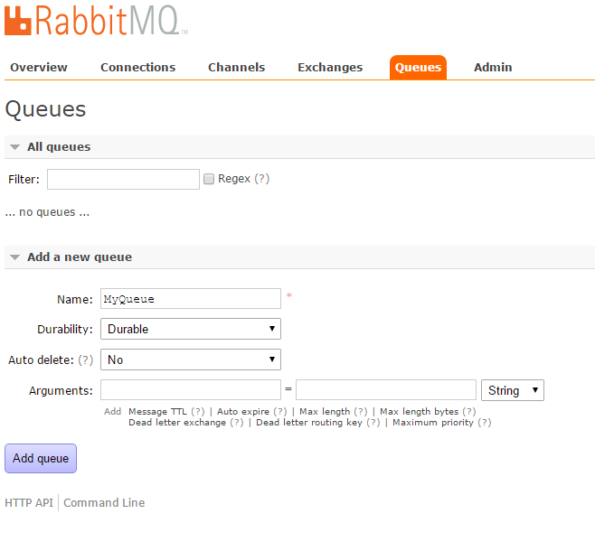 После успешной авторизации необходимо создать новую очередь сообщений на вкладке Queues.