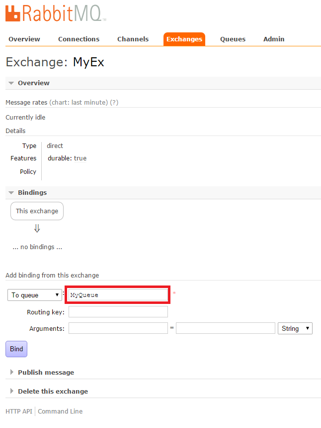 После создания точки доступа необходимо перейти на нее и привязать к ней очередь сообщений. Для этого необходимо перейти в созданную точку доступа на вкладке Exchange и в блоке Bindings вписать в строку To queue имя очереди сообщений.