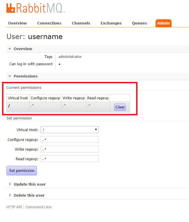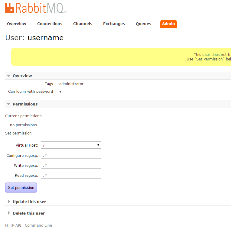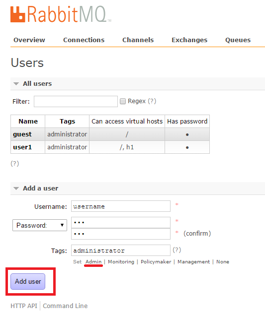 Далее необходимо создать нового пользователя. Для этого следует перейти на вкладку Admin, на которой необходимо задать имя, пароль, вручную ввести тег administrator в строку Tags и/или нажать на Admin в строке Set. Для сохранения внесенных изменений необходимо нажать на кнопку Add user.