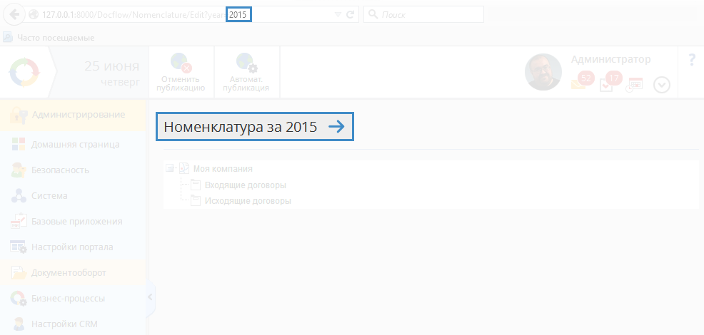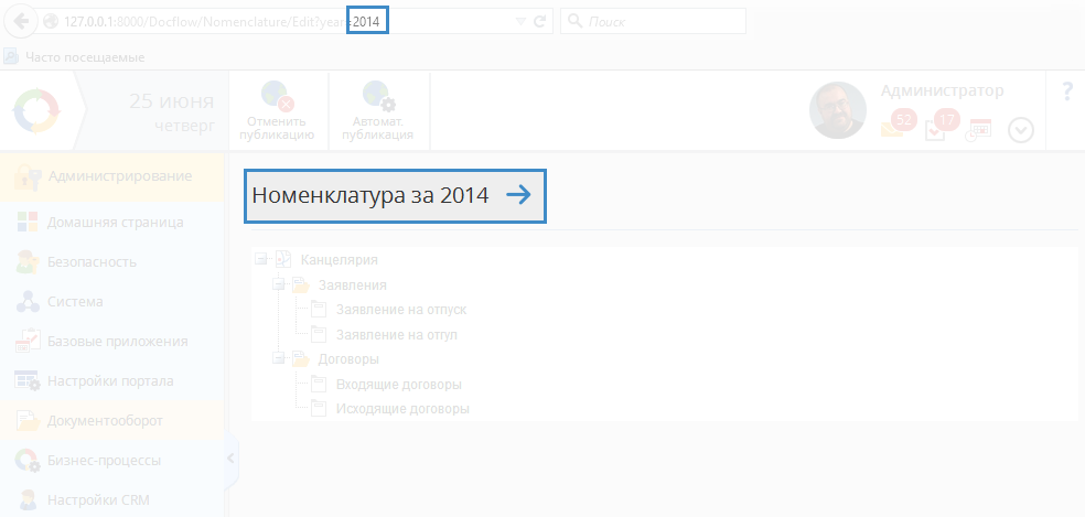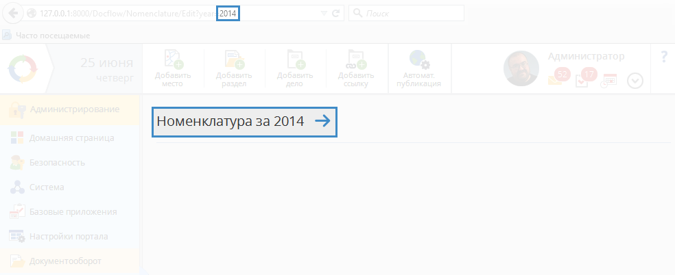 - Перейти в номенклатуру за текущий год (в веб-приложении раздел Администрирование – Документооборот – Номенклатура).