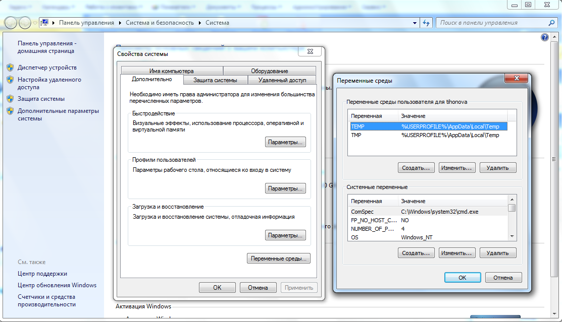 3. Открыть Компьютер – Свойства. Перейти на страницу Дополнительные параметры системы и на вкладке Дополнительно нажать на кнопку Переменные среды.