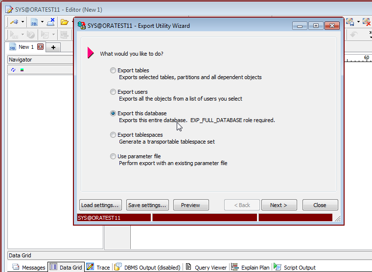 ввести grant exp_full_database to <User Id из строки подключения connectionString> и нажать на клавиатуре клавишу F5 (будут выданы права доступа на полную выгрузку базы указанному пользователю).