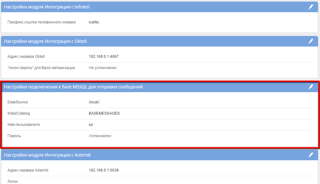 В данном примере реализованы настройки для подключения к СУБД MSSQL, в которой реализован собственный канал сообщений. Чтобы использовать данные настройки, необходимо их загрузить и использовать полученные данные. Пример использования настроек при подключении к СУБД MSSQL: