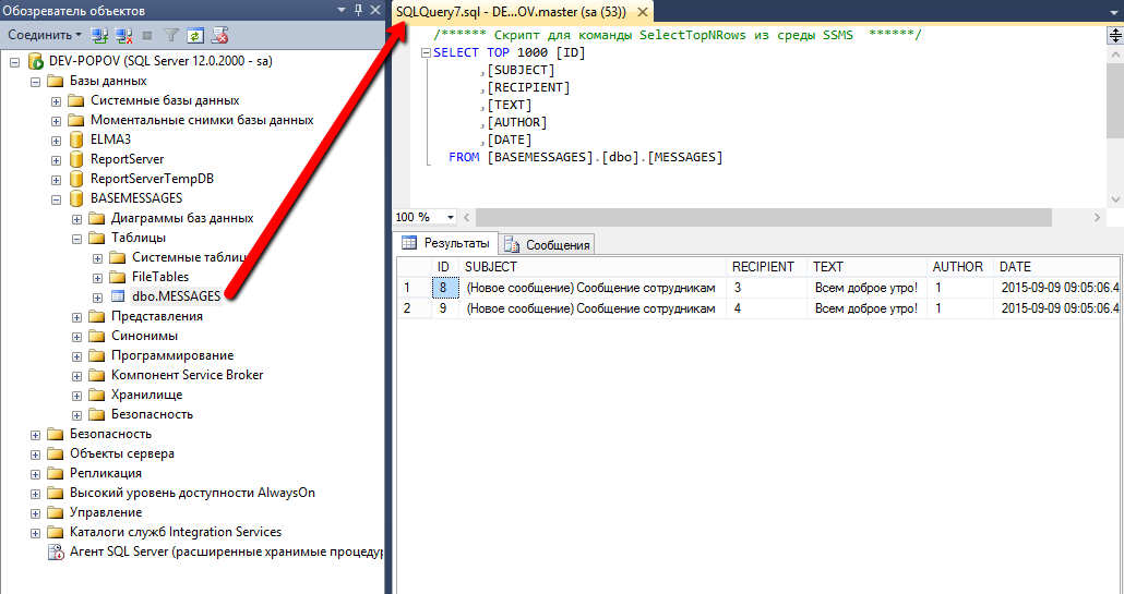 В данном примере использовалась база данных MSSQL, которую необходимо создать, скрипт создания таблицы в базе данных BASEMESSAGES: