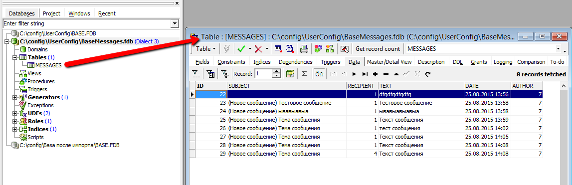 В данном примере использовалась база данных FireBird, которую необходимо создать, добавить в неё новую таблицу MESSAGES с полями: ID, SUBJECT, RECIPIENT, TEXT, DATE, AUTHOR. Поле ID необходимо сделать Primary Key и NotNull, а также создать генератор (в примере генератор имеет имя GEN_MESSAGES_ID).