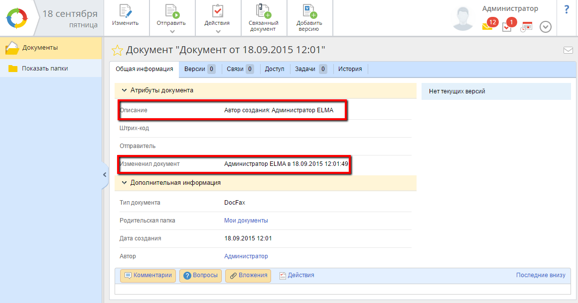 При создании документа в поле Описание будет записан автор и дата создания документа, а при изменении будет записан автор изменения и дата изменения документа в поле Изменил документ.