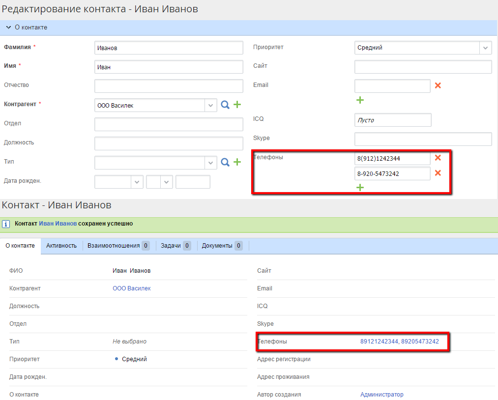 - При изменении объекта с коллекцией телефонов. Если в коллекции телефонов объекта (контрагенты, контакты, возможности) используется телефон с недопустимыми символами, недопустимые символы удаляются из номера телефона.