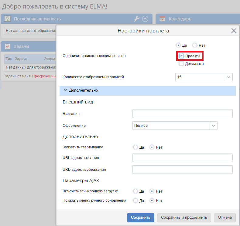 Рис. 1. Объект «Проект» в настройках портлета «Последняя активность»
