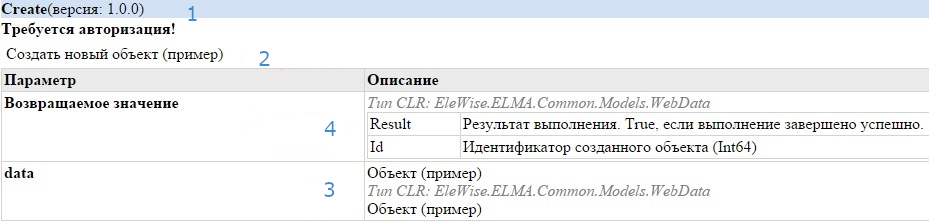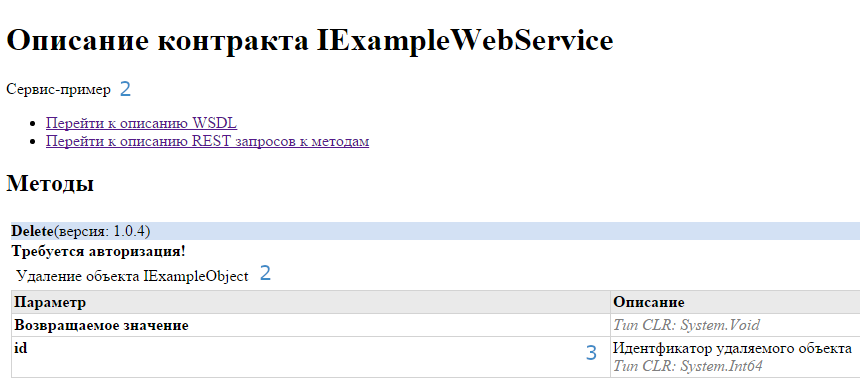 - WsdlParamOrReturnDocumentation – описание для параметров метода и возвращаемого значения. Чтобы добавить описание для возвращаемого параметра, нужно использовать [return: WsdlParamOrReturnDocumentation("Ваше описание")].