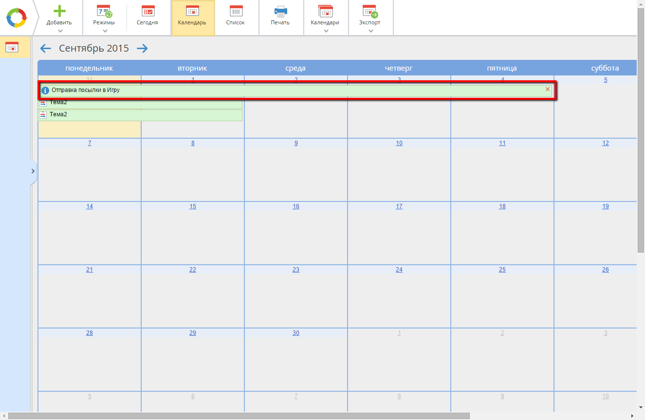 - отображение завершения события (в примере используется поле Посылка доставлена, если значение будет Да, то в календаре событие будет зачеркнутым);