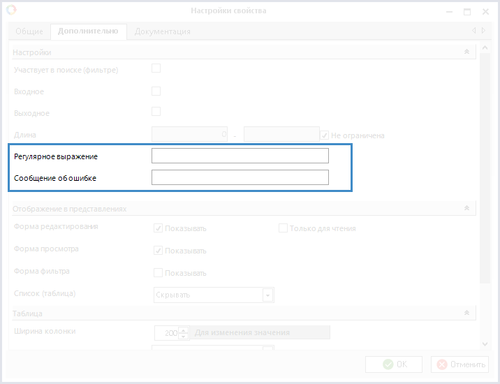 Регулярное выражение – шаблон, с помощью которого будет проверяться корректность введенной строки. В случае несоответствия в веб-приложении может быть выведено сообщение об ошибке, указанное в поле Сообщение об ошибке.