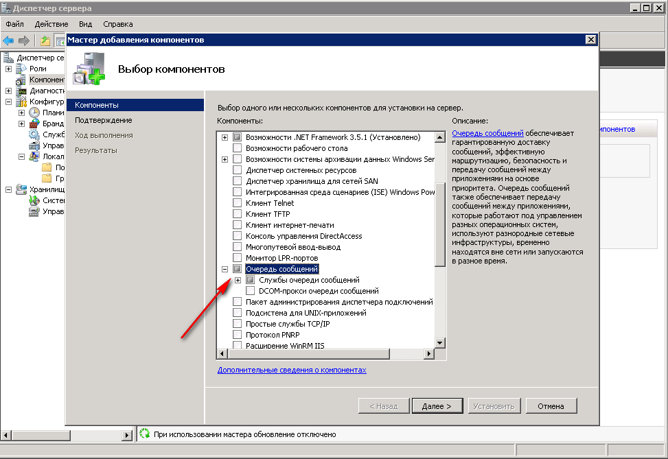 3. Устанавливаем флажки Очередь сообщений и Службы очереди сообщений, нажимаем на кнопку Далее.