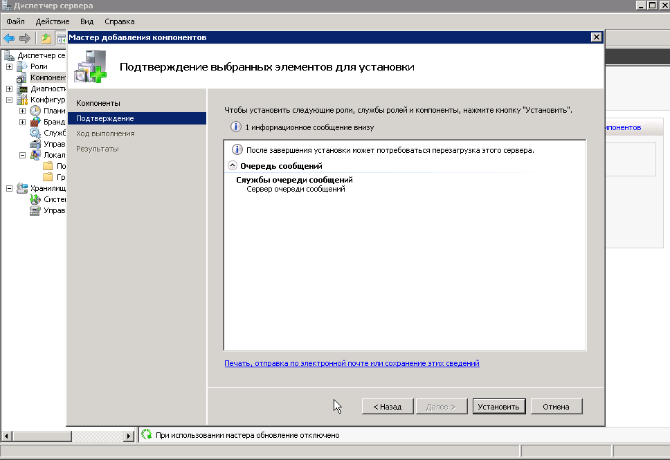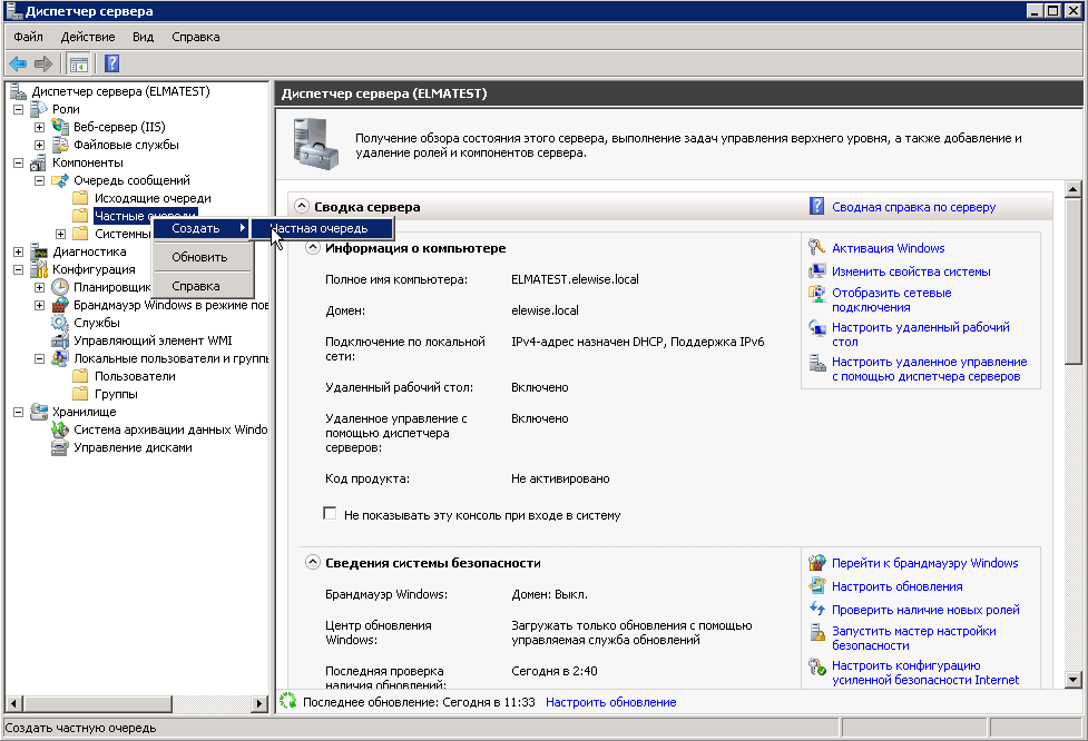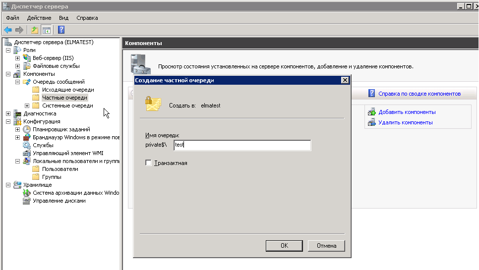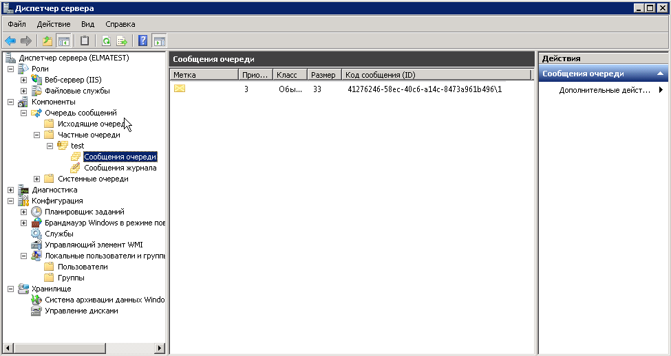 7. В Диспетчере сервера появится компонент Очереди сообщений.