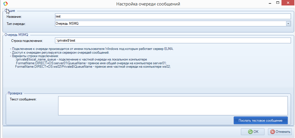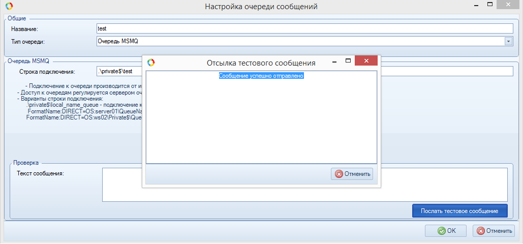 11. Для проверки работоспособности созданной очереди нажимаем на кнопку Послать тестовое сообщение - будет отображено окно с результатом отправки сообщения.