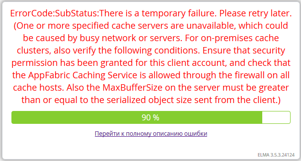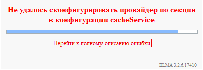 - Полный текст ошибки: EleWise.ELMA.Runtime.Exceptions.ConfigurationInitializeException: Не удалось сконфигурировать провайдер по секции в конфигурации cacheService ---> Microsoft.ApplicationServer.Caching.DataCacheException: ErrorCode:SubStatus: There is a temporary failure. Please retry later. (One or more specified cache servers are unavailable, which could be caused by busy network or servers. For on-premises cache clusters, also verify the following conditions. Ensure that security permission has been granted for this client account, and check that the AppFabric Caching Service is allowed through the firewall on all cache hosts. Also the MaxBufferSize on the server must be greater than or equal to the serialized object size sent from the client.) ---> System.ServiceModel.CommunicationException: Подключение к сокету было прервано. Возможно, это вызвано ошибкой обработки сообщения, превышением времени ожидания на удаленном узле или проблемой с выделенным сетевым ресурсом. Тайм-аут локального сокета: "10675199.02:48:05.4775807". ---> System.IO.IOException: Сбой операции чтения, см. внутреннее исключение. ---> System.ServiceModel.CommunicationException: Подключение к сокету было прервано. Возможно, это вызвано ошибкой обработки сообщения, превышением времени ожидания на удаленном узле или проблемой с выделенным сетевым ресурсом. Тайм-аут локального сокета: "10675199.02:48:05.4775807". ---> System.Net.Sockets.SocketException: Удаленный хост принудительно разорвал подключение.