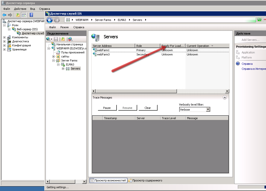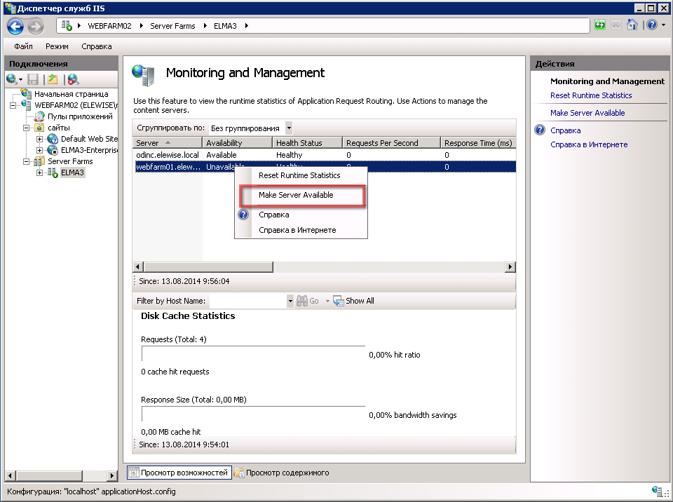 - Решение: Заходим на головную ВМ, далее идем в Диспетчер служб IIS – WEBFARM-Servers Farms – ELMA3 – Servers. Если у ферм стоит статус Unknown, его надо заменить на Yes.