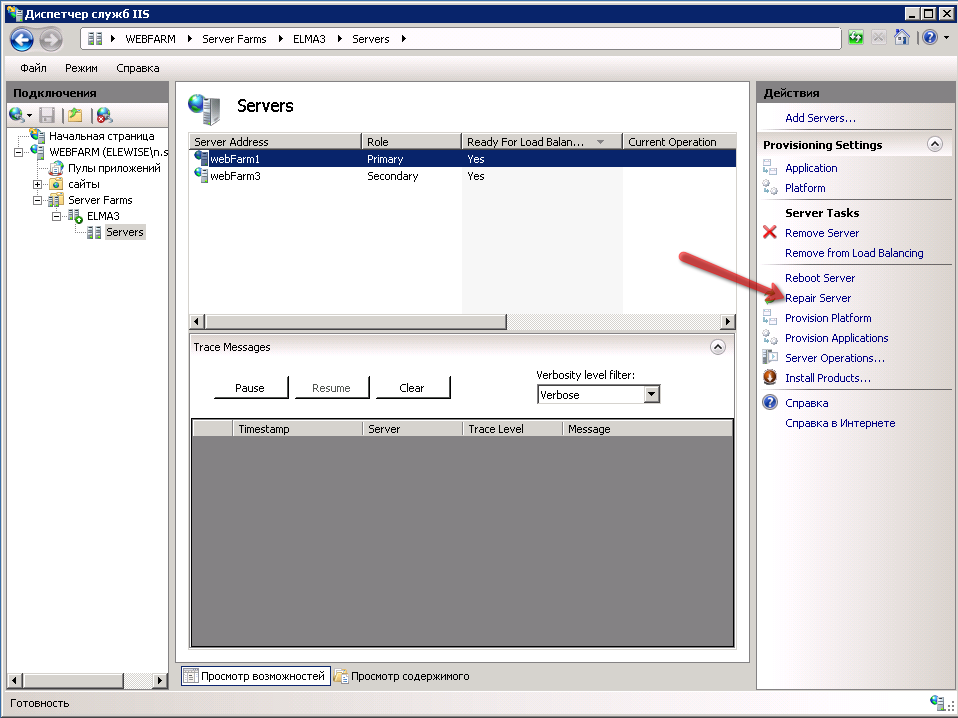 Далее нужно выбрать первую ферму и в правом меню нажать на ссылку Repair Server.