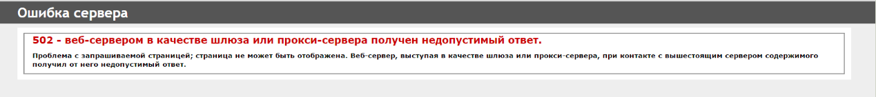 6. Ошибка: 502 – веб-сервером в качестве шлюза или прокси-сервера получен недопустимый ответ (возникает часто, но не постоянно).
