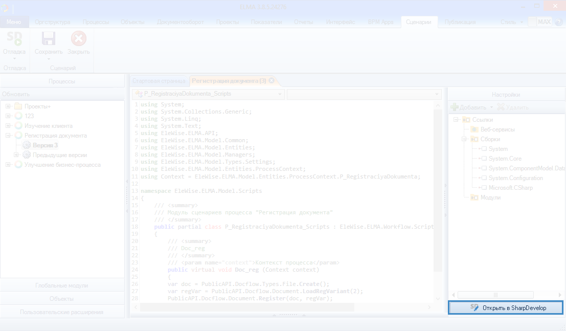 Рис. 2. Дизайнер ELMA. Вкладка "Сценарии". Кнопка "Открыть в SharpDevelop"
