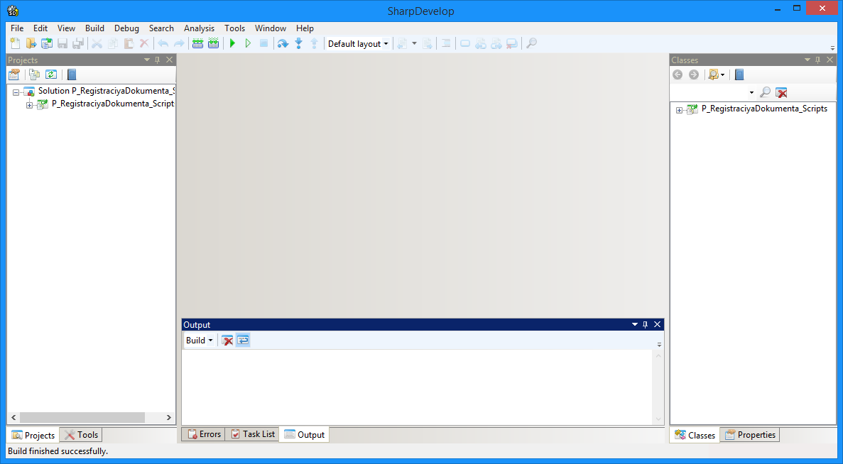 Для перехода к редактированию кода в SharpDevelop необходимо в левом меню Projects дважды нажать на требуемый сценарий – будет открыто окно редактора сценариев (рис. 6).