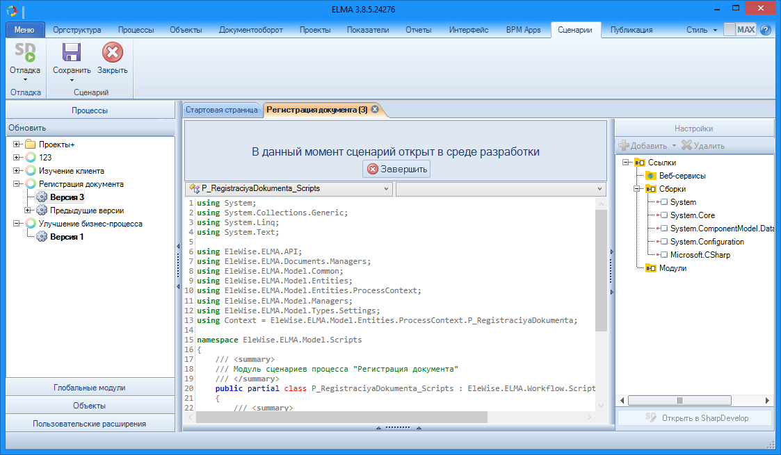 С версии системы 3.8 редактор сценариев был упрощен – были убраны многие функциональные возможности в угоду быстродействию системы. Однако возможность работы в расширенном редакторе осталась. Для этого можно использовать встроенную в Дизайнер ELMA среду SharpDevelop или VisualStudio версии 10, 12 или 13, если он установлен.