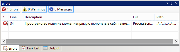 Для проверки сценария на ошибки необходимо нажать на клавиатуре F9. Проверка может занять некоторое время, необходимо дождаться ее окончания. В том случае, если в ходе проверки были обнаружены ошибки, данные о них будут отображены в окне Errors (рис. 7).