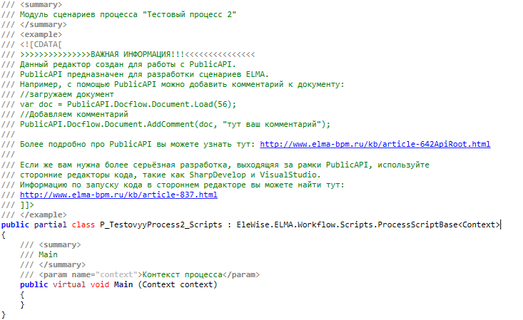 Простые сценарии в системе ELMA рекомендуется создавать с использованием Public API. Public API – это набор методов системы, собранных в иерархическую структуру и предназначенных для разработки сценариев в системе ELMA. Подробнее о работе с Public API см. в соответствующей статье.