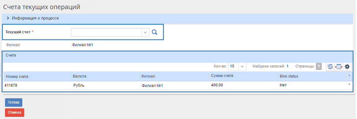 В общем случае решение уже готово и его можно корректно использовать в процессе, однако для пользователя выбор счета будет крайне неудобен, так как в выпадающем списке он не увидит ничего, кроме номера счета.