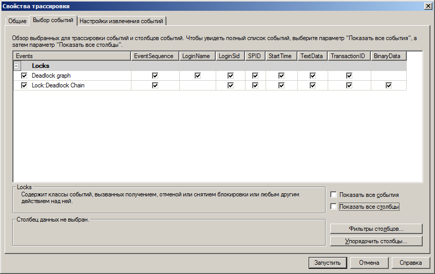 2.1. Настройте логирование deadlock: вкладка Выбор событий, событие Deadlock graph (рис.1).