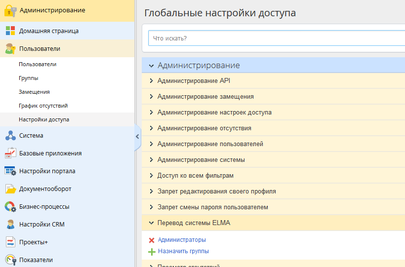 Чтобы функция перевода системы ELMA была доступна пользователю, необходимо в разделе Администрирование – Пользователи – Настройки доступа – Глобальные настройки доступа в блоке Администрирование – Перевод системы ELMA назначить права доступа для нужной группы пользователей (Рис. 1).