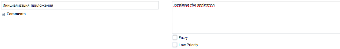 Ниже перевода фразовой единицы отображаются флажки Fuzzy и Low Priority, позволяющие установить соответствующие признаки фильтрации для текущей фразовой единицы.