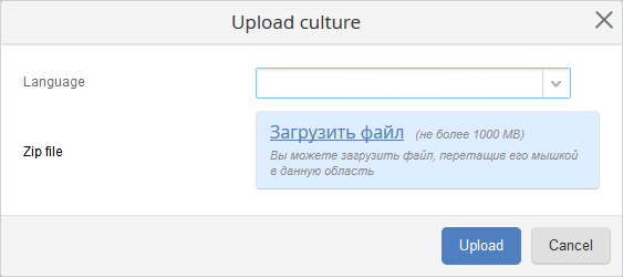 При нажатии на данную кнопку открывается диалоговое окно (Рис. 13), в котором необходимо из выпадающего списка выбрать требуемый язык и прикрепить архив с настройками языка, после чего нажать на кнопку Download.