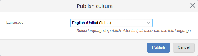 — публикация нового языкового проекта. При нажатии на данную кнопку открывается диалоговое окно (Рис. 14), в котором необходимо из выпадающего списка выбрать язык, который необходимо опубликовать, и нажать на кнопку Publish.