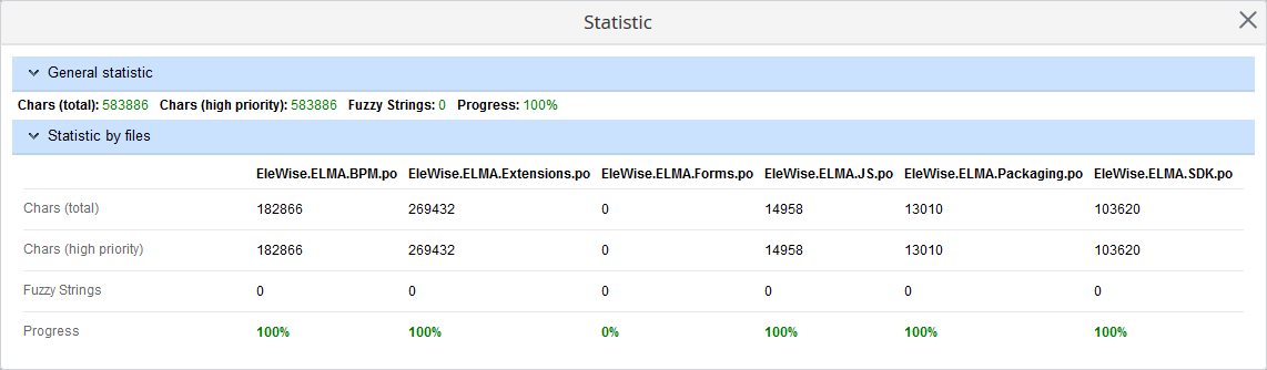 — статистика по переведенным языковым файлам. При нажатии на данную кнопку открывается диалоговое окно (Рис. 15) с общей статистикой и статистикой по файлам.